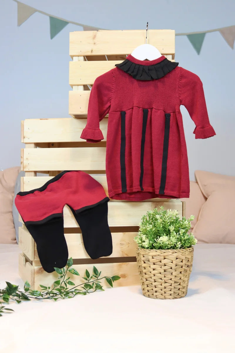 Adorable matching set for girls. Knitted in a viscose blend. The dress fastens with buttons at the back, the dress has matching knickers and a pair of covered toe leggings to complete the outfit.