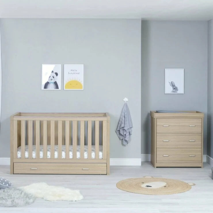 The Babymore Luno and Veni range offers a modern, warm, and clean design, with its neat lines and a beautifully textured Warm Oak wood effect finish. It will sit stylishly in your baby’s nursery. This 2-piece room set consists of the Veni cot bed, changing unit. There is coordinated cot bed under drawer included.