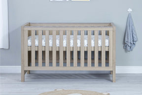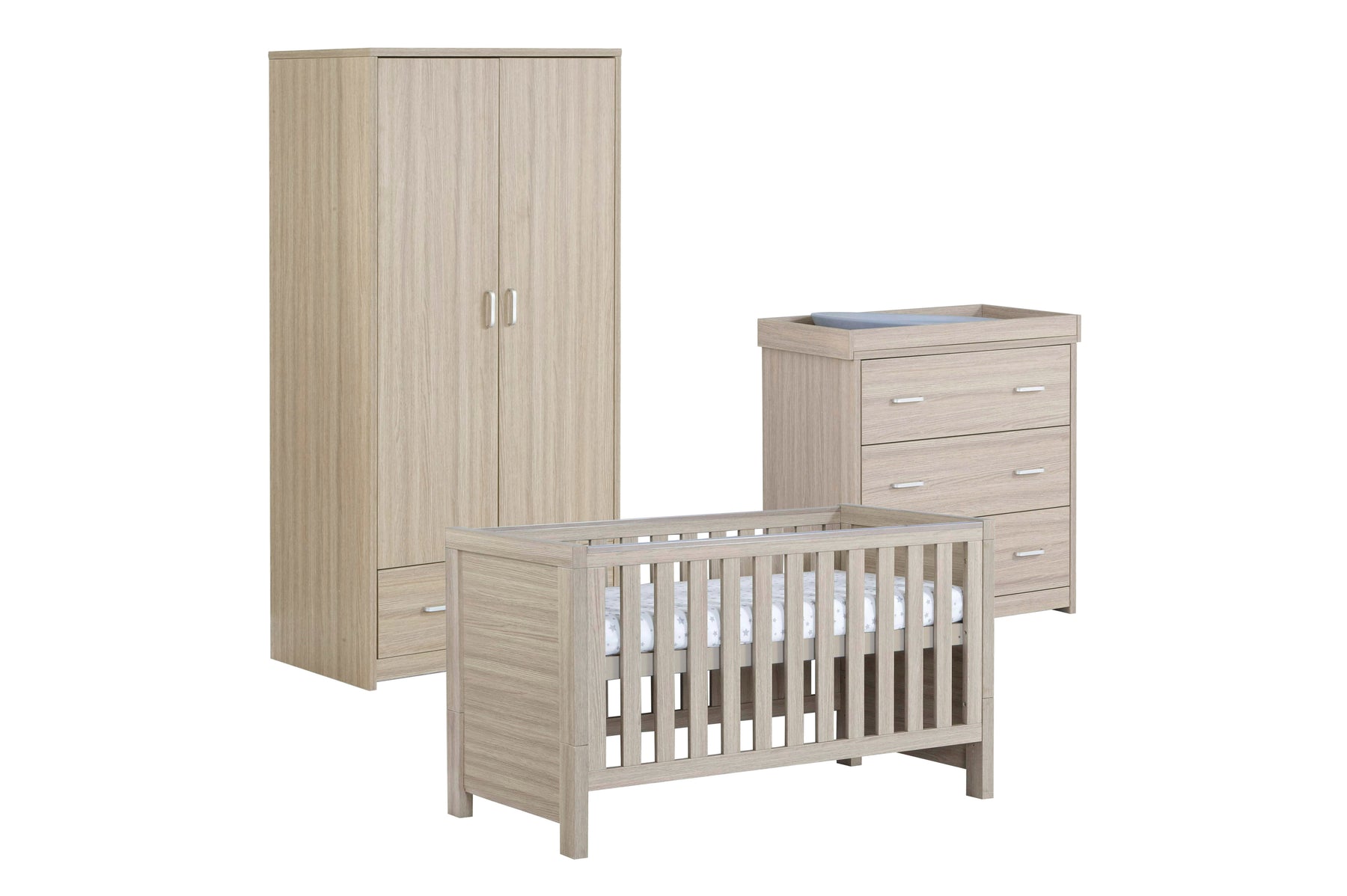 The Luno and Veni range offers a modern, warm, and clean design, with its neat lines and a beautifully textured Warm Oak wood effect finish. It will sit stylishly in your baby’s nursery. This 3-piece room set consists of Luno cot bed, changing unit and double wardrobe. There is also the option of a coordinated cot bed under drawer, and cot top changer.