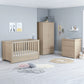 The Luno and Veni range offers a modern, warm, and clean design, with its neat lines and a beautifully textured Warm Oak wood effect finish. It will sit stylishly in your baby’s nursery. This 3-piece room set consists of Luno cot bed, changing unit and double wardrobe. There is also the option of a coordinated cot bed under drawer, and cot top changer.